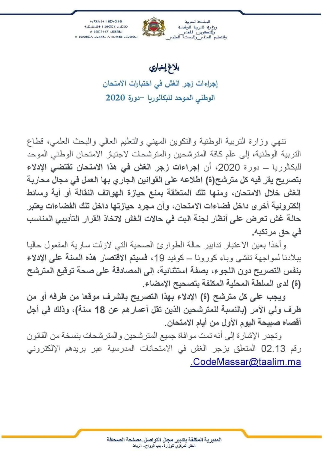 تنهي وزارة التربية الوطنية والتكوين المهني والتعليم العالي والبحث العلمي، قطاع التربية الوطنية، إلى علم كافة المترشحين والمترشحات لاجتياز الامتحان الوطني الموحد للبكالوريا – دورة 2020، أن إجراءات زجر الغش في هذا الامتحان تقتضي الإدلاء بتصريح يقر فيه كل مترشح(ة) اطلاعه على القوانين الجاري بها العمل في مجال محاربة الغش خلال الامتحان، ومنها تلك المتعلقة بمنع حيازة الهواتف النقالة أو أية وسائط إلكترونية أخرى داخل فضاءات الامتحان، وأن مجرد حيازتها داخل تلك الفضاءات يعتبر حالة غش تعرض على أنظار لجنة البت في حالات الغش لاتخاذ القرار التأديبي المناسب في حق مرتكبه.